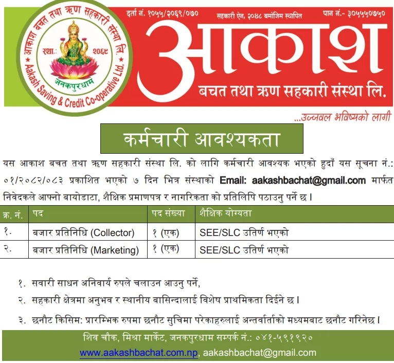 Job Vacancy at Aakash Saving & Credit Cooperative Ltd. – Janakpurdham