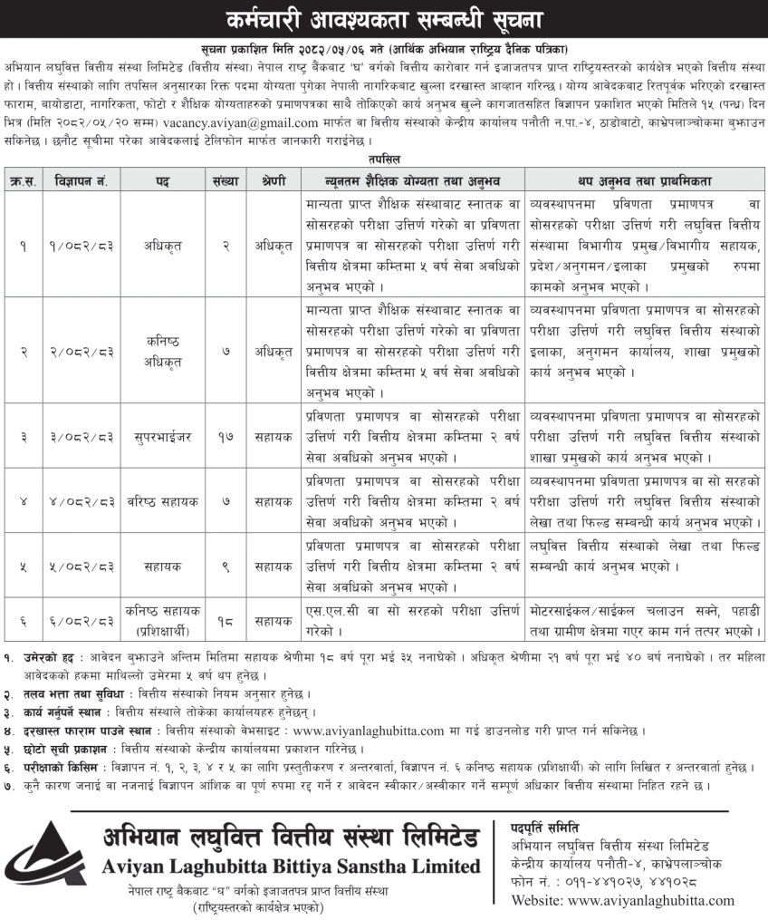 Aviyan Laghubitta Vacancy 2082 – Bank job – Apply Now