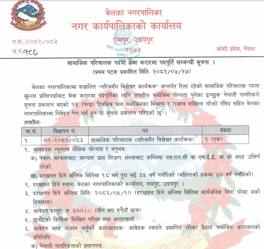 📢 Note: For more details, refer to the official notice or visit Belka Municipality Office, Rampur, Udayapur.