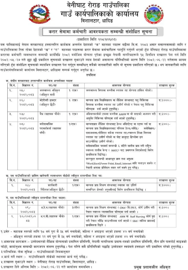 Benighat Rorang Gaunpalika, Gaun Executive Office, Bishaltar, Dhading has published a revised notice for contract-based employee recruitment. Eligible Nepali citizens are invited to apply for multiple health and administrative positions under programs transferred from the Federal Government, Rural Water Supply Management Board, and approved posts of the Gaunpalika.