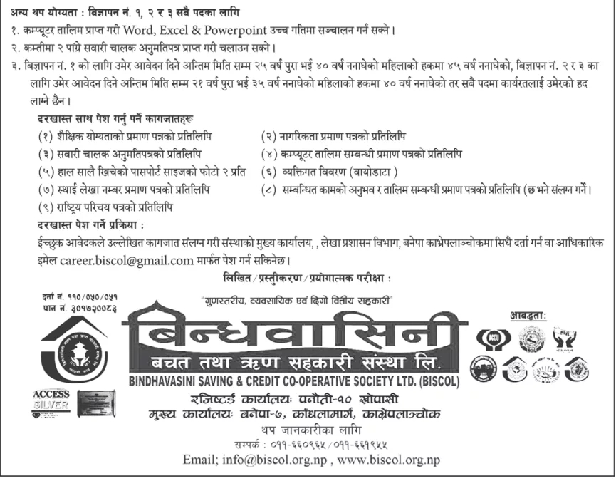 Job Vacancy Announcement – Bindhavasini Saving & Credit Cooperative Ltd. (BISCOL)
