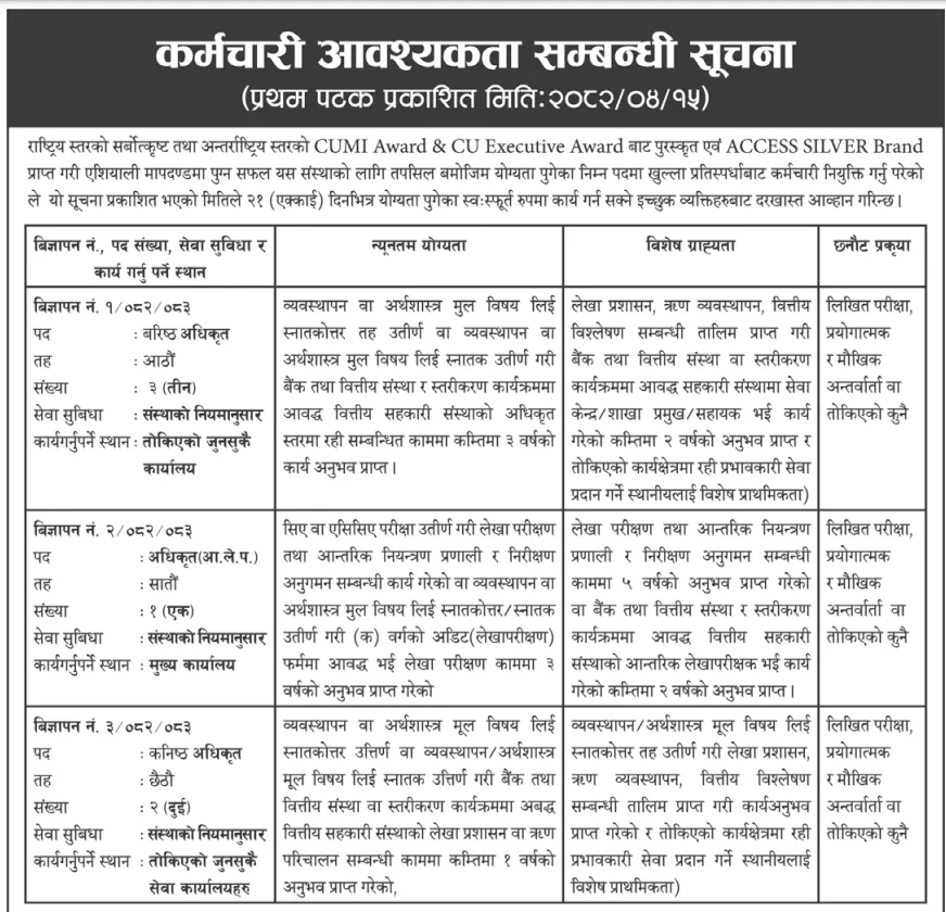 - Bachelor’s degree with minimum 3 years of experience in Officer-level position in bank, financial institutions, or tiered cooperatives