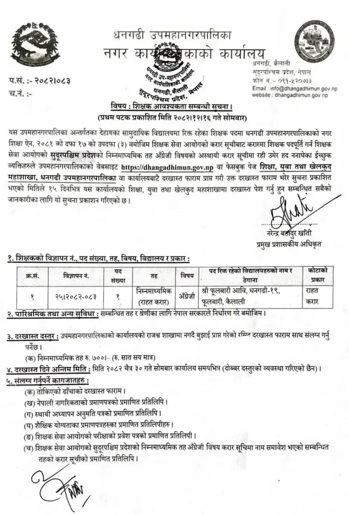 Dhangadhi Sub Metropolitan City Teacher Vacancy 2082