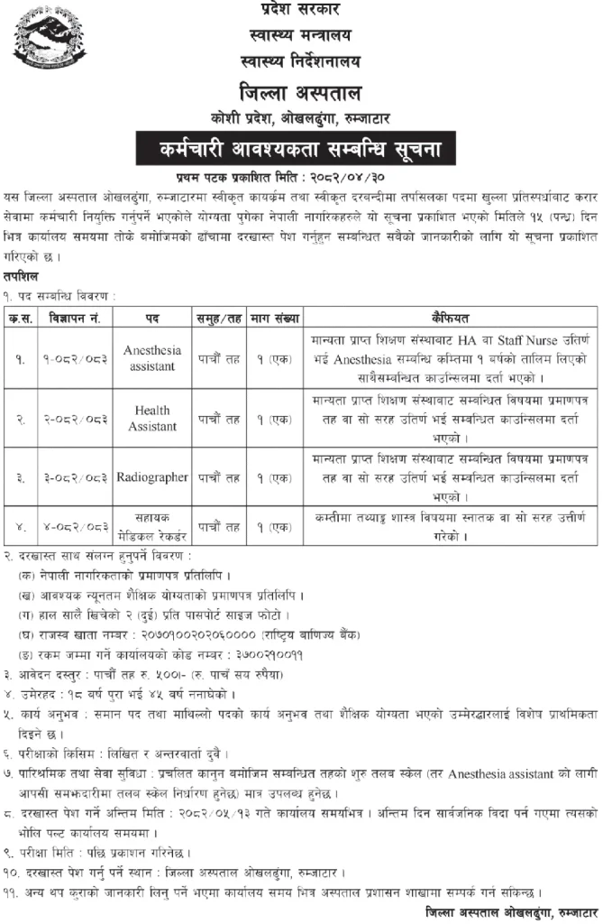 Job Vacancy Notice โ€“ District Hospital Okhaldhunga, Rumjatar (Koshi Province)