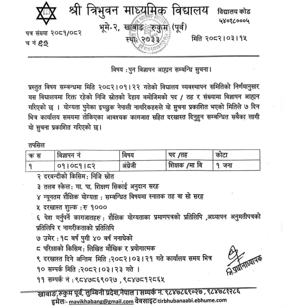 As per the decision of the School Management Committee dated 2082/01/22, Tribhuwan Secondary School, Khawang, invites applications from qualified and eligible Nepali citizens for the following teaching position under a private source. Interested candidates are encouraged to apply within 7 days from the date of this announcement along with the required documents during office hours.
