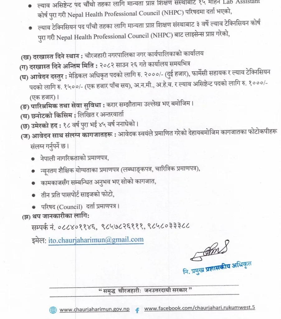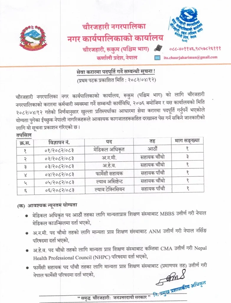 Chaurjahari Municipality, Office of the Municipal Executive, announces the following contract-based vacancies in accordance with the “Procedure for Employee Management in Contract Service, 2076”. Eligible Nepali citizens are invited to apply for the following healthcare posts: