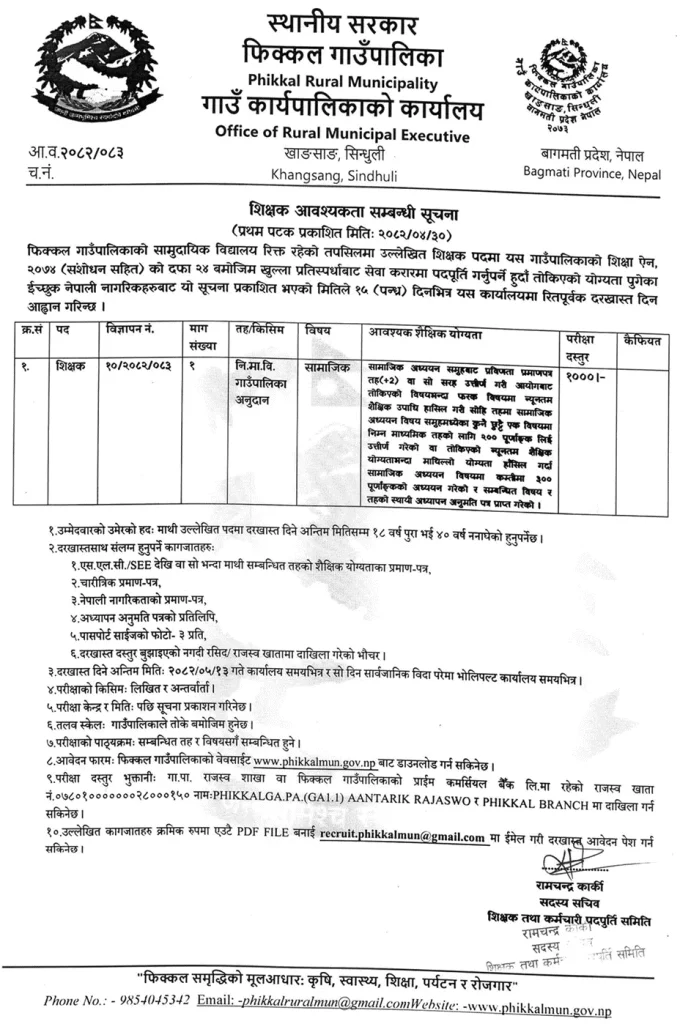 Phikkal Rural Municipality, Bagmati Province, Sindhuli has announced a Government Teacher Vacancy 2082/083 under contract service. Eligible Nepali citizens are invited to apply for the vacant teacher position in the community school.
