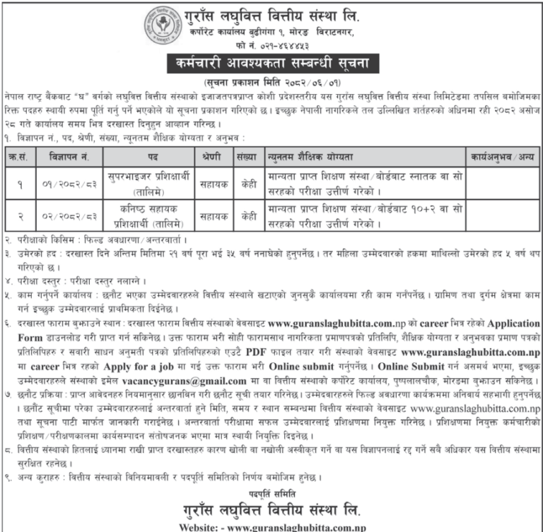 - If unable to submit online, applicants can email the documents to vacancygurans@gmail.com or submit them directly at the Corporate Office, Pushpalal Chowk, Morang.