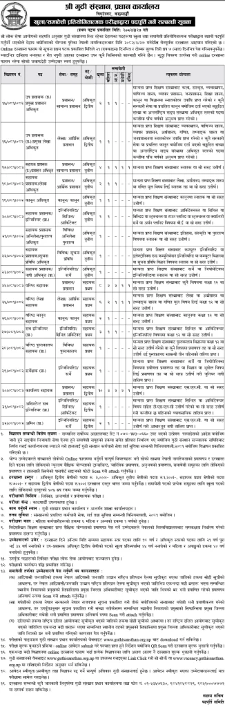 Guthi Sansthan, with the approval of the Public Service Commission, has announced a vacancy for various permanent positions through open and inclusive competitive examinations. Qualified Nepali citizens are invited to apply online within 21 days from the first date of publication (2082/03/27), or within an additional 7 days with double the application fee.