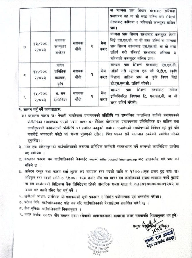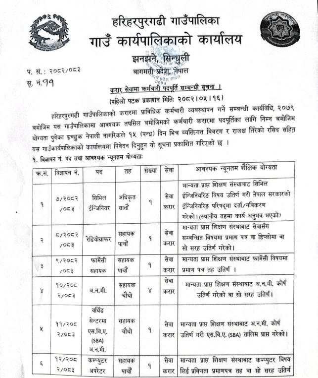 Hariharpurgadhi Rural Municipality Job Vacancy 2085 – Contract Staff Recruitment