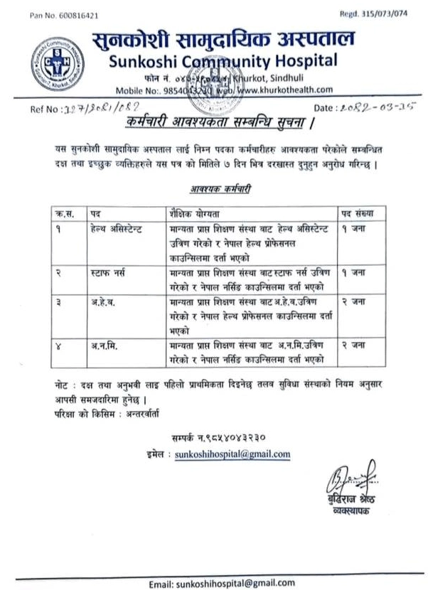 Sunkoshi Community Hospital, Khurkot, Sindhuli invites applications from qualified and interested Nepali candidates for the following positions. Apply within 7 days from the date of publication.