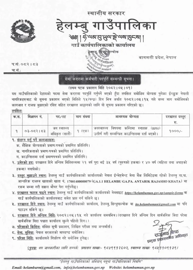Job Vacancy: Public Health Officer โ Helambu Rural Municipality (Sindhupalchok, Bagmati Province)
