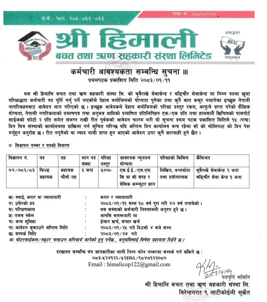 Himali Saving and Credit Cooperative Vacancy 2026 | Field Assistant Jobs in Nepal | Latest Cooperative Jobs