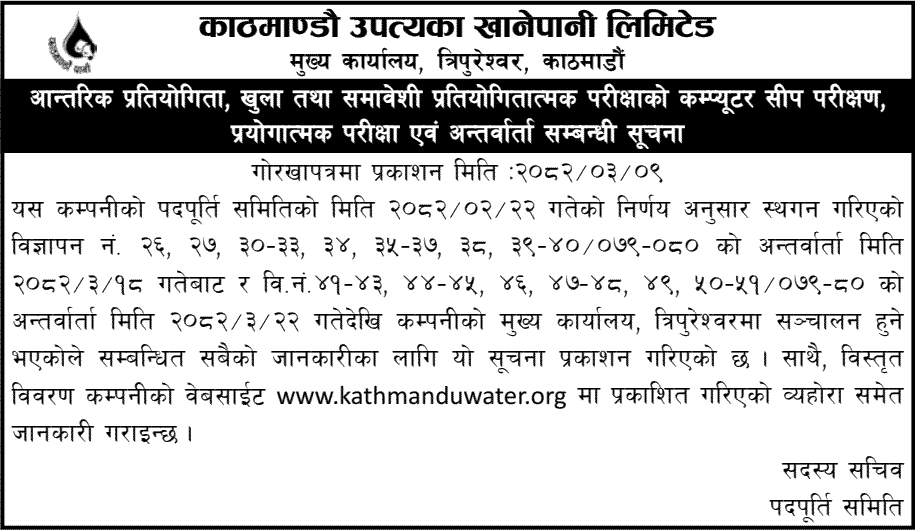 This notice is published to inform all concerned candidates. For detailed information, please visit the company’s official website: www.kathmanduwater.org.