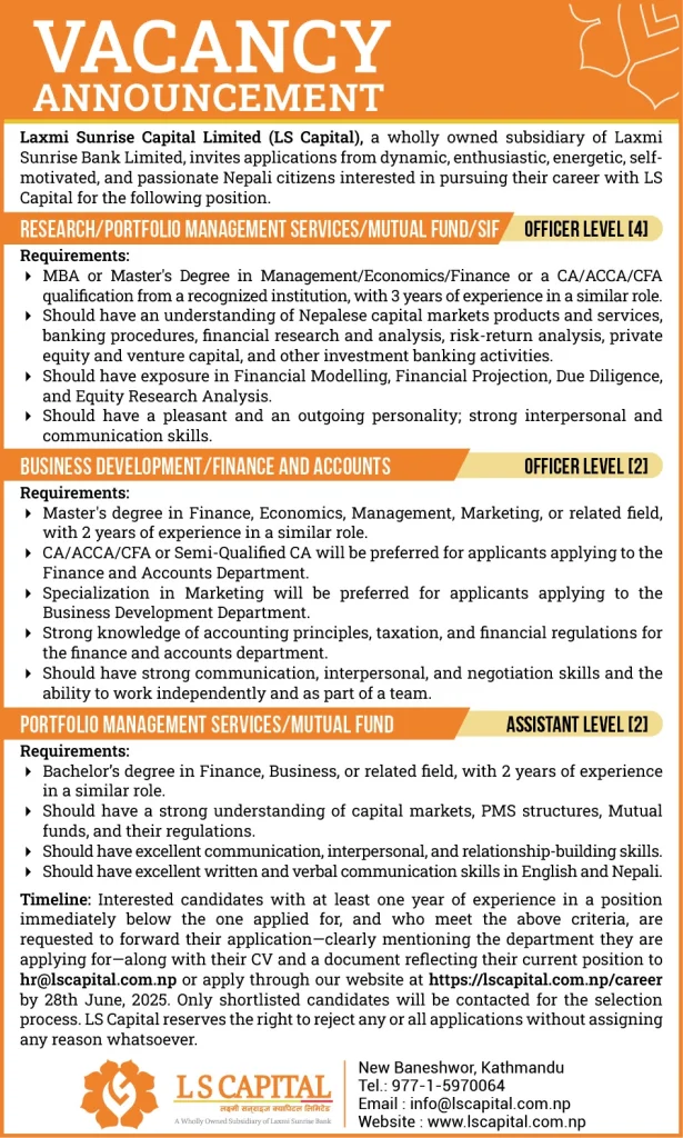 Laxmi Sunrise Capital Limited (LS Capital), a wholly owned subsidiary of Laxmi Sunrise Bank Limited, is inviting applications from qualified, passionate, and dynamic Nepali citizens seeking to advance their careers in the Nepalese capital market and financial services industry.