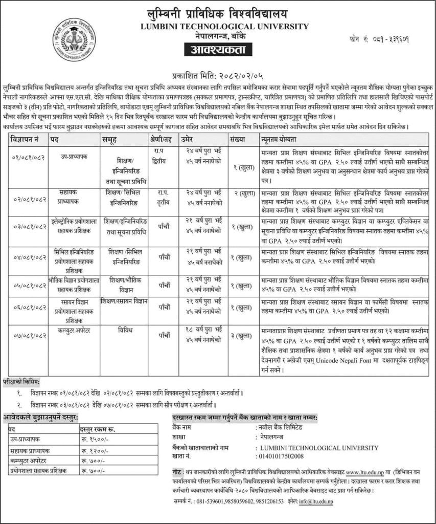 Lumbini Technological University (LTU), Nepalgunj, announces vacancies for various contractual positions under the Institute of Engineering and Information Technology. Eligible and interested Nepali citizens are invited to apply for the positions as listed in the notice below. Applications must be submitted within 15 days from the date of this announcement.