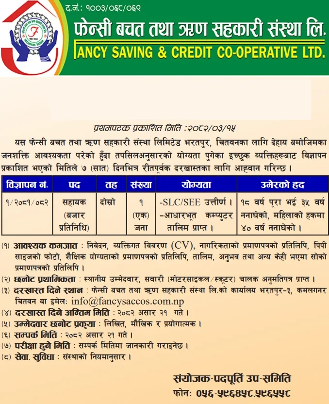 Job Vacancy Announcement | Fancy Saving & Credit Cooperative Ltd. | Chitwan, Nepal