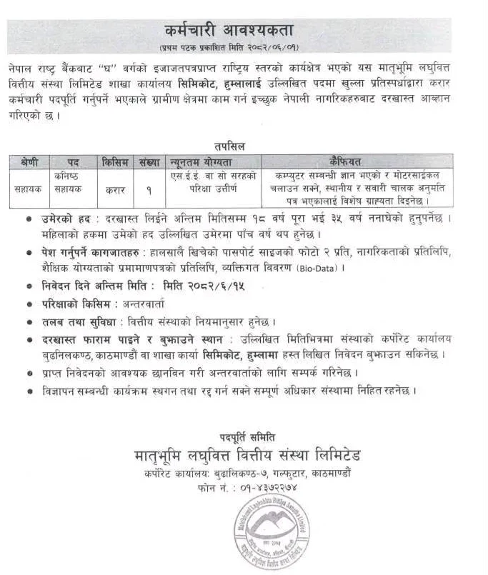Matru Bhumi Laghubitta Bittiya Sanstha Ltd. is a Nepal Rastra Bank licensed national-level microfinance institution (‘D’ class). To strengthen its financial services in rural areas, the institution is seeking dynamic and motivated candidates for the position of Junior Assistant on a contract basis.