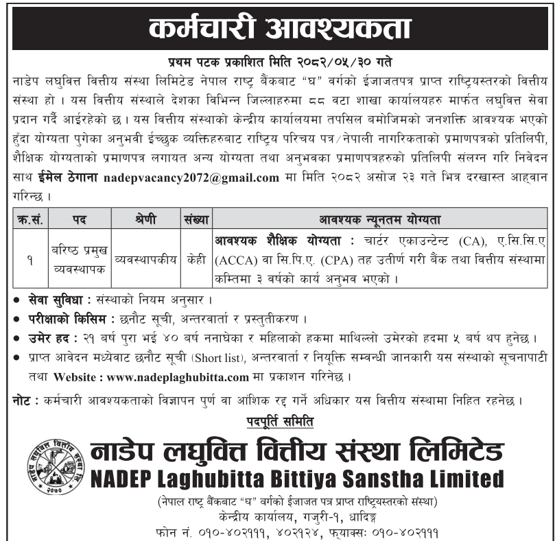 NADEP Laghubitta Bittiya Sanstha Limited, licensed as a “D” class national-level microfinance institution by Nepal Rastra Bank, is providing microfinance services through 88 branch offices across Nepal. The head office announces vacancy for the following position: