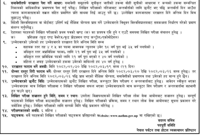 The Nepal Academy of Tourism and Hotel Management (NATHM) under the Ministry of Culture, Tourism and Civil Aviation, Government of Nepal, invites applications from qualified Nepali citizens for various vacant positions through open and inclusive competitive examination.