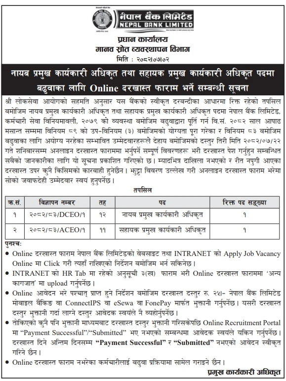 Nepal Bank Limited, under the approval of the Public Service Commission, invites eligible internal candidates to apply online for promotion to the following key executive positions based on the approved staffing structure and the provisions of Nepal Bank Employee Service Regulations 2079.