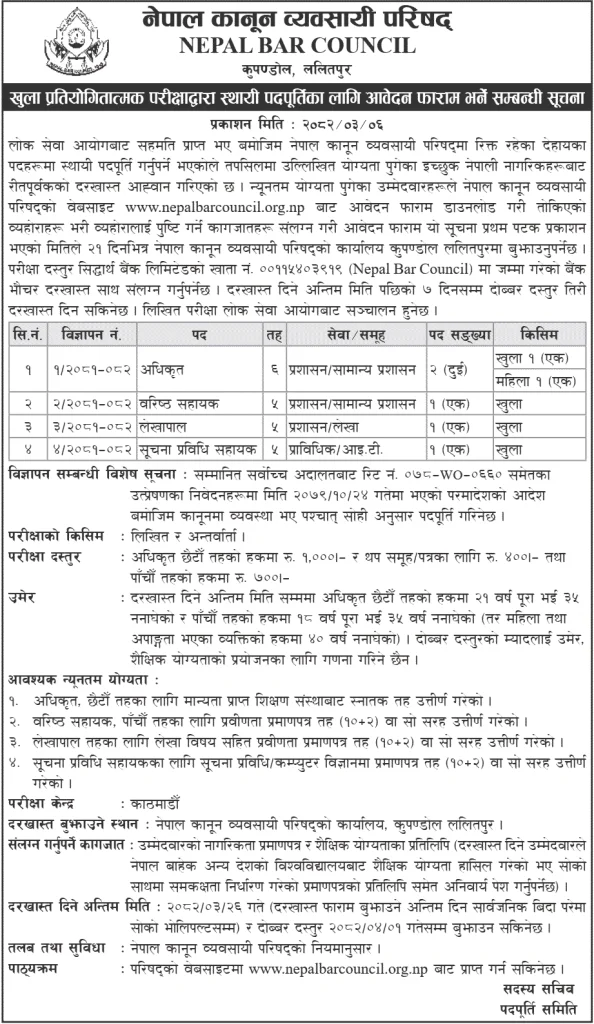 The Nepal Bar Council, with the approval of the Public Service Commission, invites applications from qualified Nepali citizens for permanent positions through an open competitive examination process.