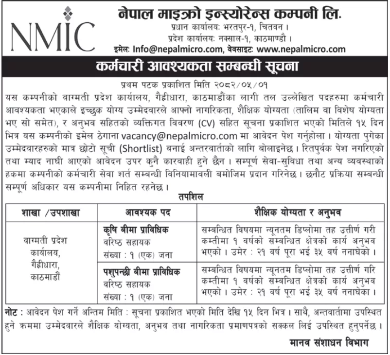 Nepal Micro Insurance Company Ltd. (NMIC), one of the leading micro insurance providers in Nepal, has announced a career opportunity in the insurance sector. The company is looking for qualified and experienced candidates for its Bagmati Province Office, Gairidhara, Kathmandu.
