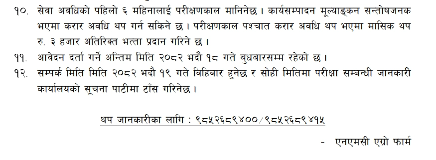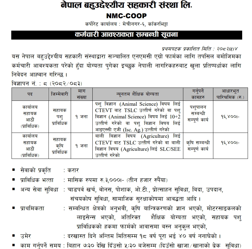 NMC Agro Farm, operated by Nepal Multipurpose Cooperative Ltd., is inviting applications from eligible Nepali citizens for the following technical positions under open competition: