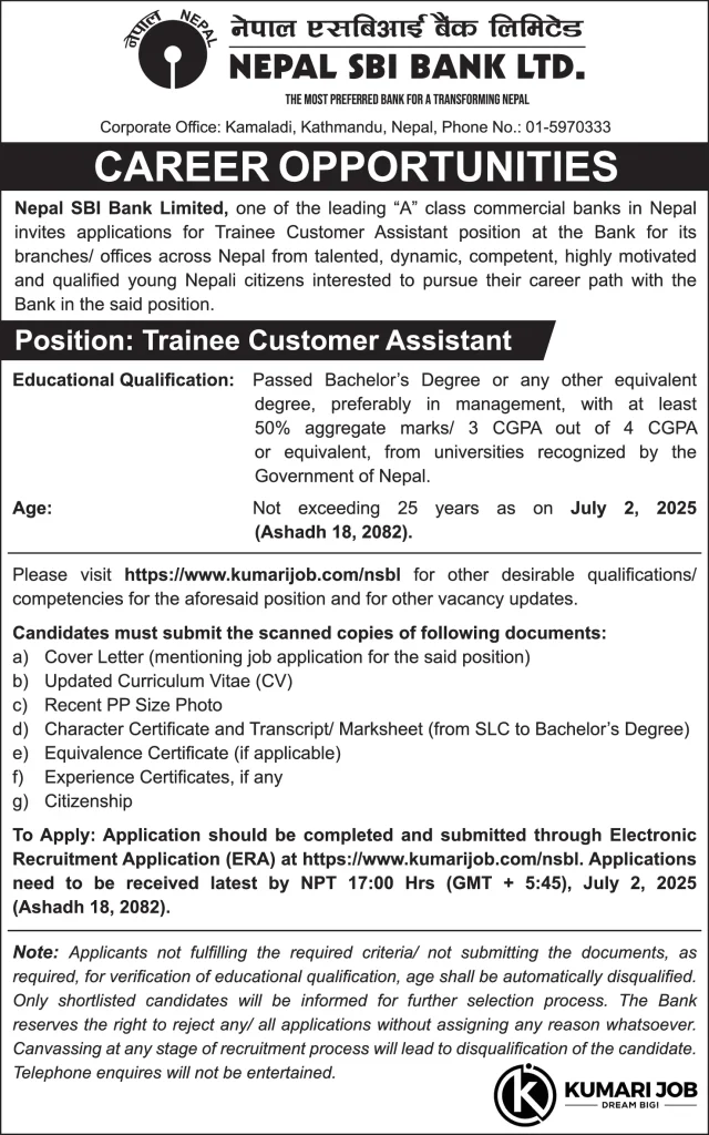 Nepal SBI Bank Limited, a leading “A” class commercial bank in Nepal, is seeking applications from enthusiastic, talented, and motivated Nepali citizens for the position of Trainee Customer Assistant. This is an excellent opportunity for young individuals aspiring to build a rewarding career in the banking sector.