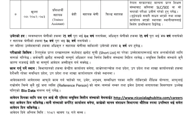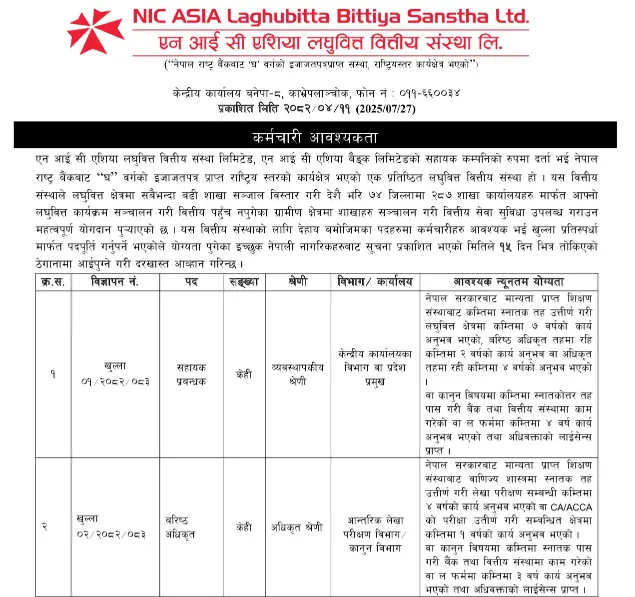 NIC ASIA Laghubitta Bittiya Sanstha Ltd., a reputed national-level microfinance institution licensed under class “D” by Nepal Rastra Bank and a subsidiary of NIC ASIA Bank Ltd., is currently operating in 74 districts through 287 branch offices. To expand its dynamic team, the institution invites applications from qualified, competent, and motivated Nepali citizens for the following positions on a competitive basis.