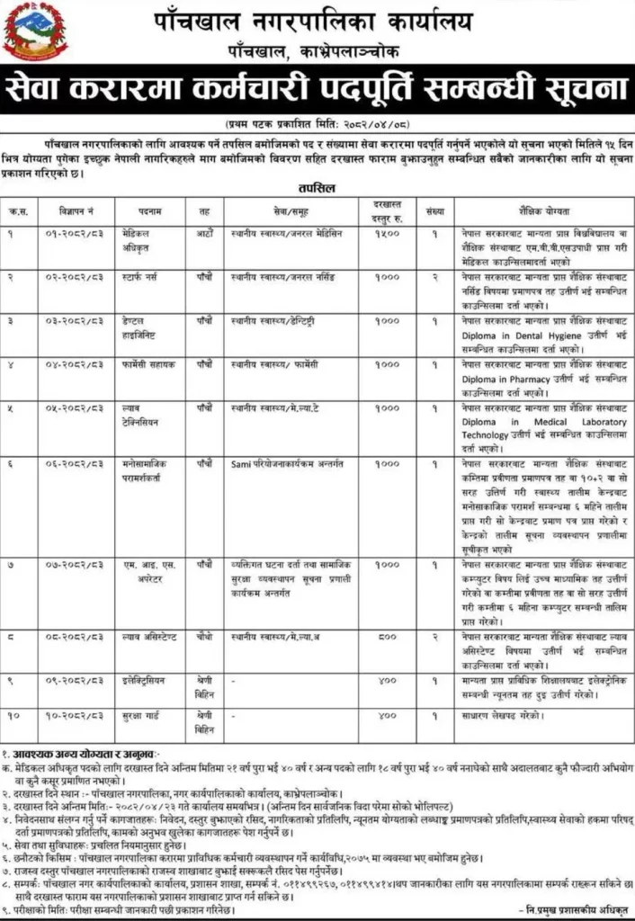 Panchkhal Municipality invites applications from qualified Nepali citizens for various health and technical contract positions as listed below. This is a great opportunity for those looking for government jobs in Nepal, especially in the health sector, on a service contract basis.