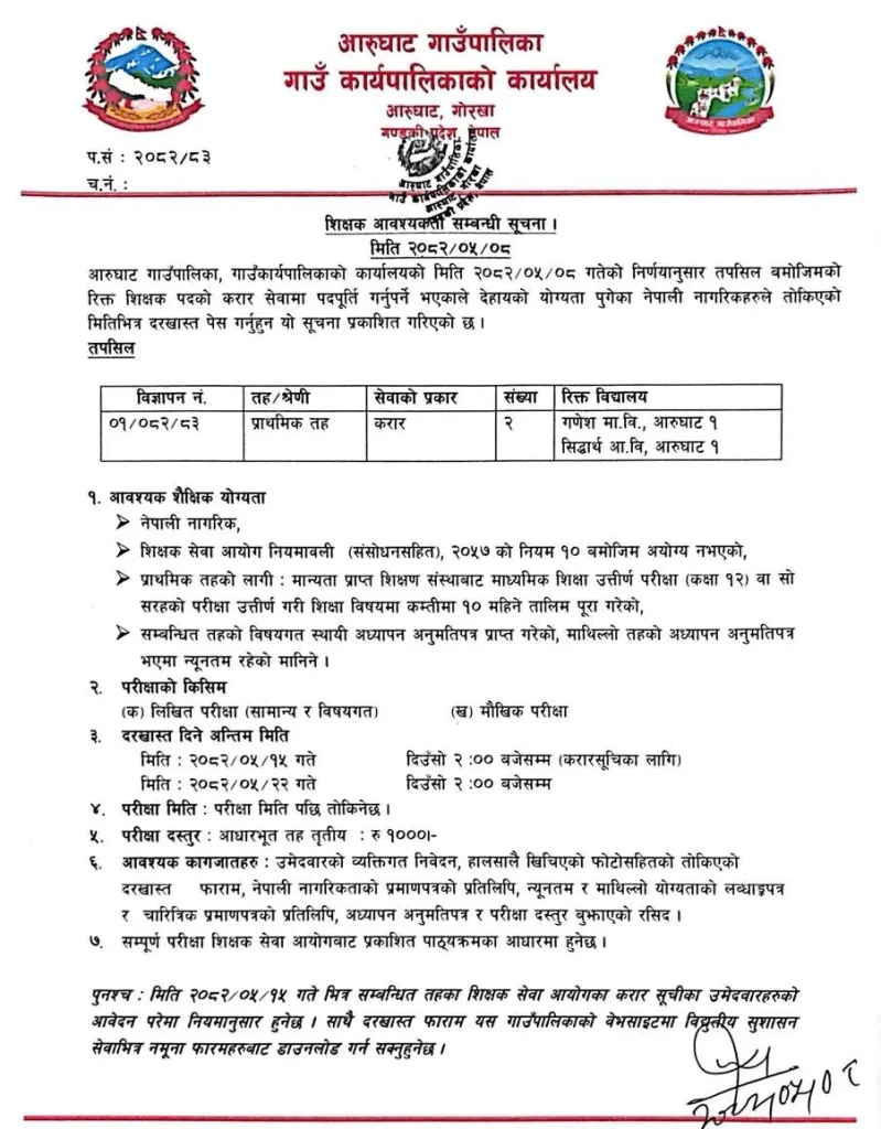 Aarughat Rural Municipality Teacher Vacancy Announcement 2082