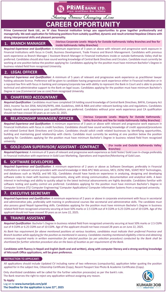 Prime Commercial Bank Ltd. is hiring dynamic, qualified, and result-oriented Nepalese citizens for multiple banking positions across Nepal. If you have strong interpersonal skills, a pleasant personality, and relevant qualifications, don’t miss this career-changing opportunity.