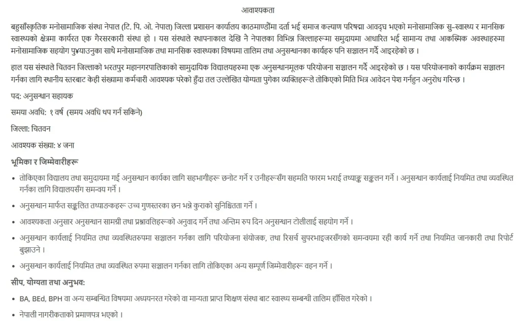 Transcultural Psychosocial Organization Nepal (TPO Nepal), a leading NGO working in psychosocial and mental health sectors, invites applications from qualified and motivated candidates for a Research Assistant position.