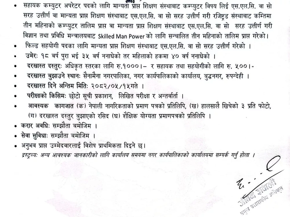 Sainamaina Municipality, Office of Municipal Executive, Rupandehi, Nepal has announced multiple job vacancies on a contract basis. Qualified and interested Nepali citizens are invited to apply within 15 days from the notice publication date.