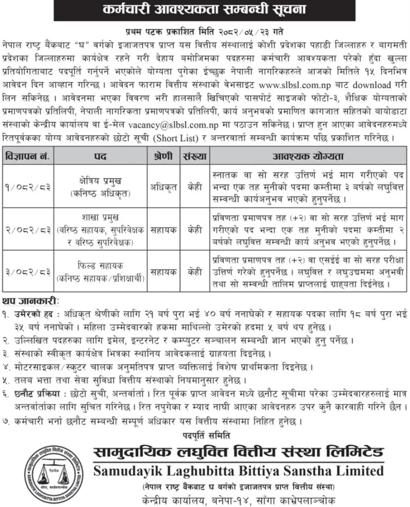 Samudayik Laghubitta Bittiya Sanstha Limited, a “Class D” licensed financial institution by Nepal Rastra Bank, invites applications from qualified Nepali citizens for multiple positions in the hilly districts of Koshi and Bagmati Provinces. Interested candidates can apply online or via email.
