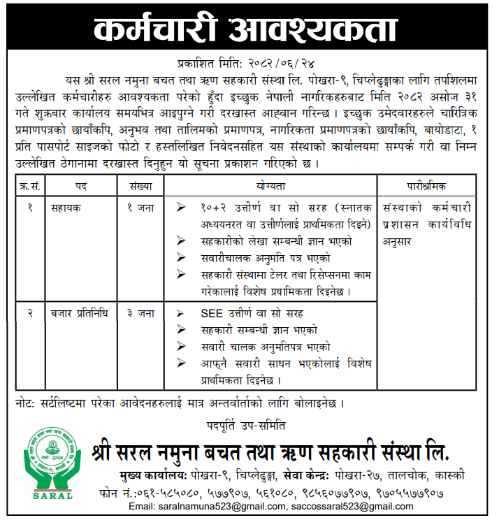 Saral Namuna Saving and Credit Cooperative Limited, one of the reputed financial cooperatives in Pokhara, invites applications from qualified and energetic Nepali citizens for the following posts. This is an excellent opportunity for candidates seeking a cooperative job in Pokhara or banking-related career in Nepal.