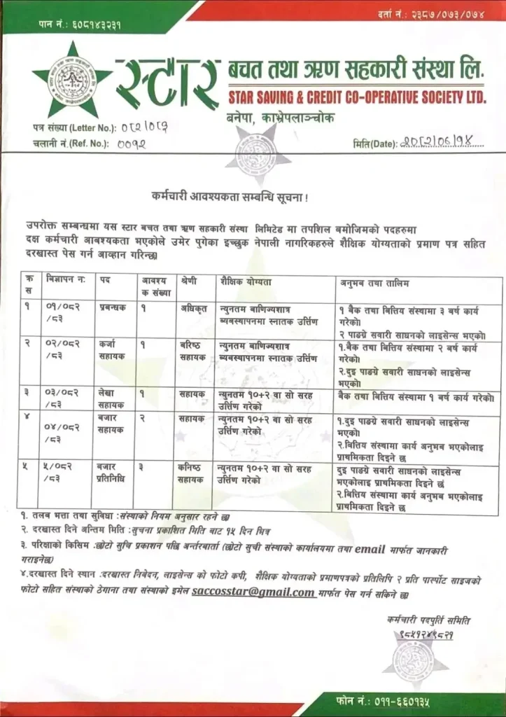 STAR Saving & Credit Cooperative Society Ltd. Job Vacancy Notice 2025 (Banepa, Kavrepalanchok)