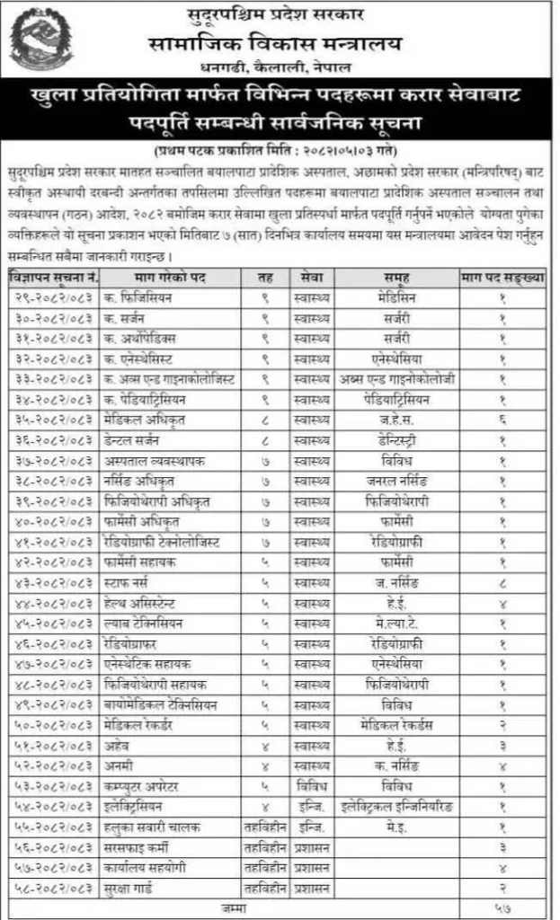 The Ministry of Social Development, Sudurpashchim Province, has announced an open competition for various health and administrative posts at Bayalpata Provincial Hospital, Achham. Eligible Nepali citizens are invited to apply within the deadline.