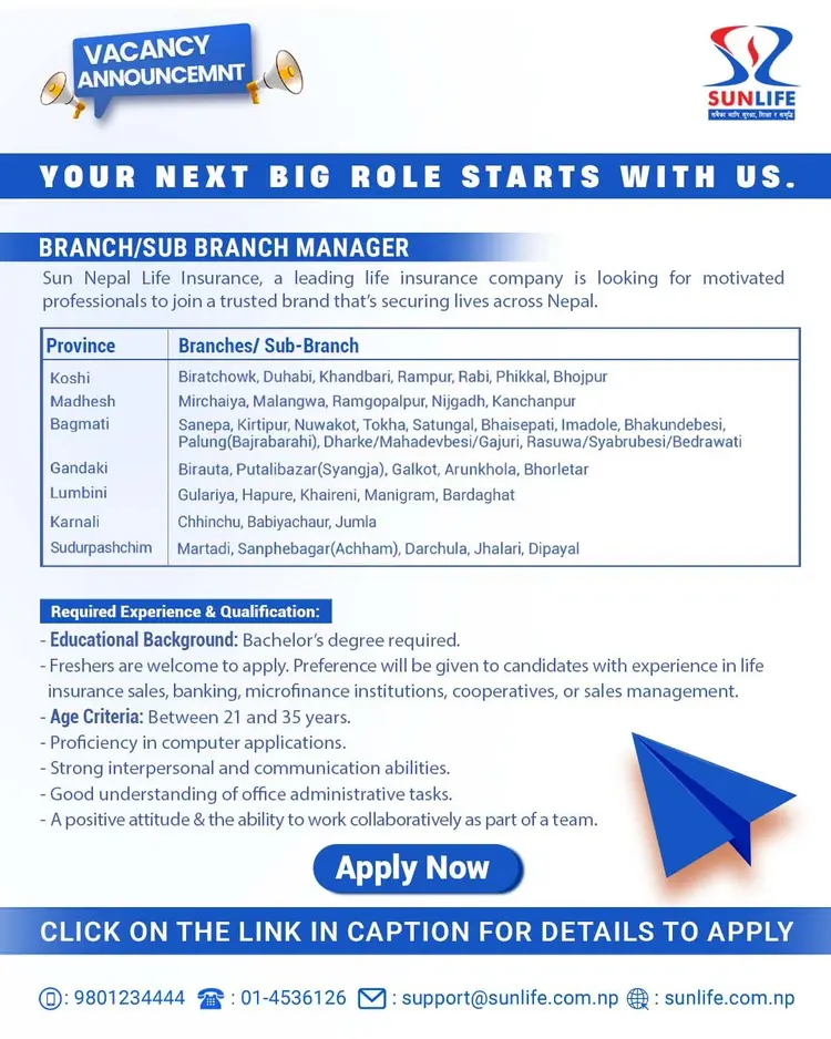 Sun Nepal Life Insurance Ltd., one of Nepal’s most trusted and leading life insurance companies, is expanding nationwide. We’re on the lookout for motivated individuals to join us as Branch and Sub-Branch Managers across various locations.
