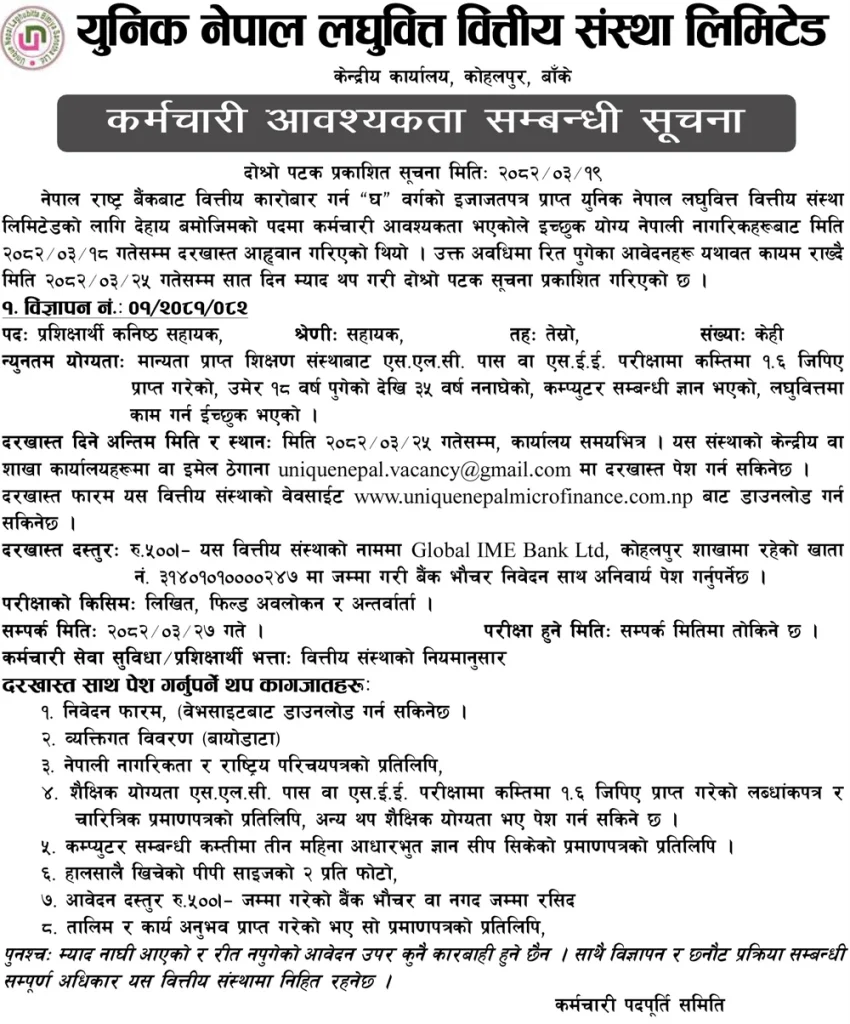 Unique Nepal Laghubitta Bittiya Sanstha Ltd. is seeking qualified and interested Nepali citizens for the following position. The vacancy was initially published with an application deadline of 2082/03/18. As the organization requires more applications, the deadline has now been extended to 2082/03/25. Previous valid applicants will be considered.
