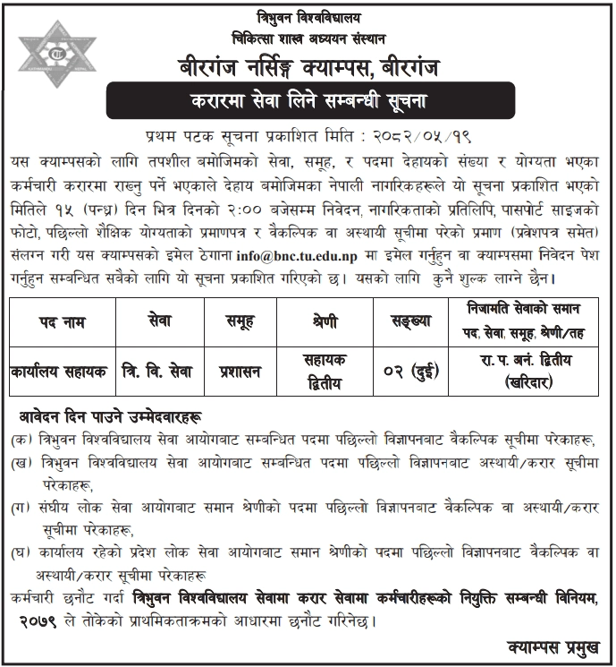 Tribhuvan University Birgunj Nursing Campus Job Vacancy 2082 – Office Assistant (Contract Service)