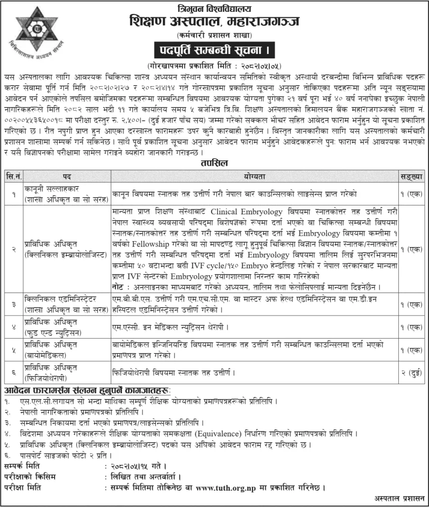👉 This is a great opportunity for healthcare professionals in Nepal including medical doctors, hospital administrators, biomedical engineers, physiotherapists, nutritionists, and legal experts to build their careers with Tribhuvan University Teaching Hospital (TUTH), Maharajgunj.